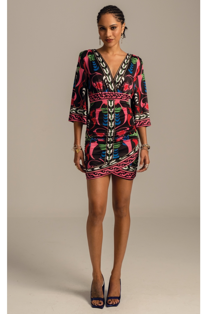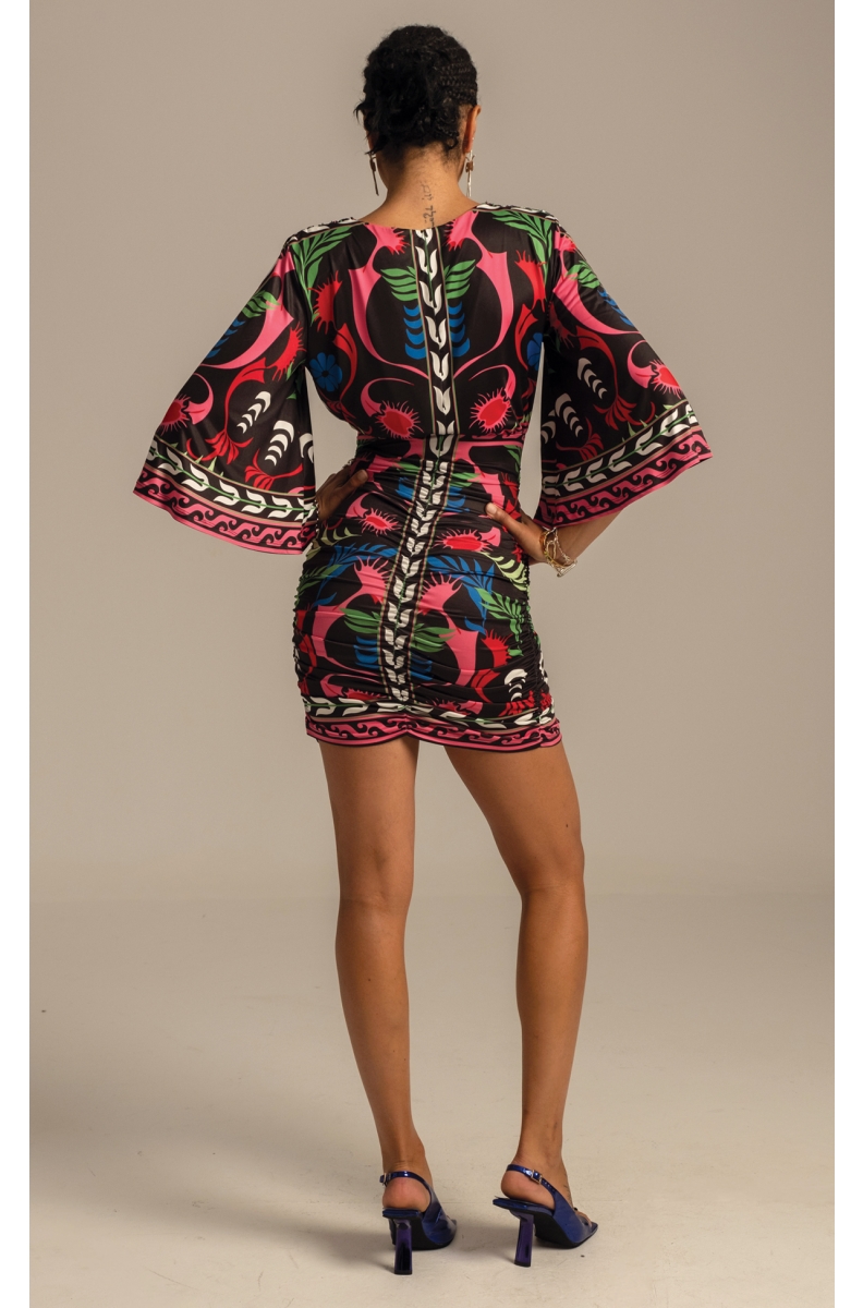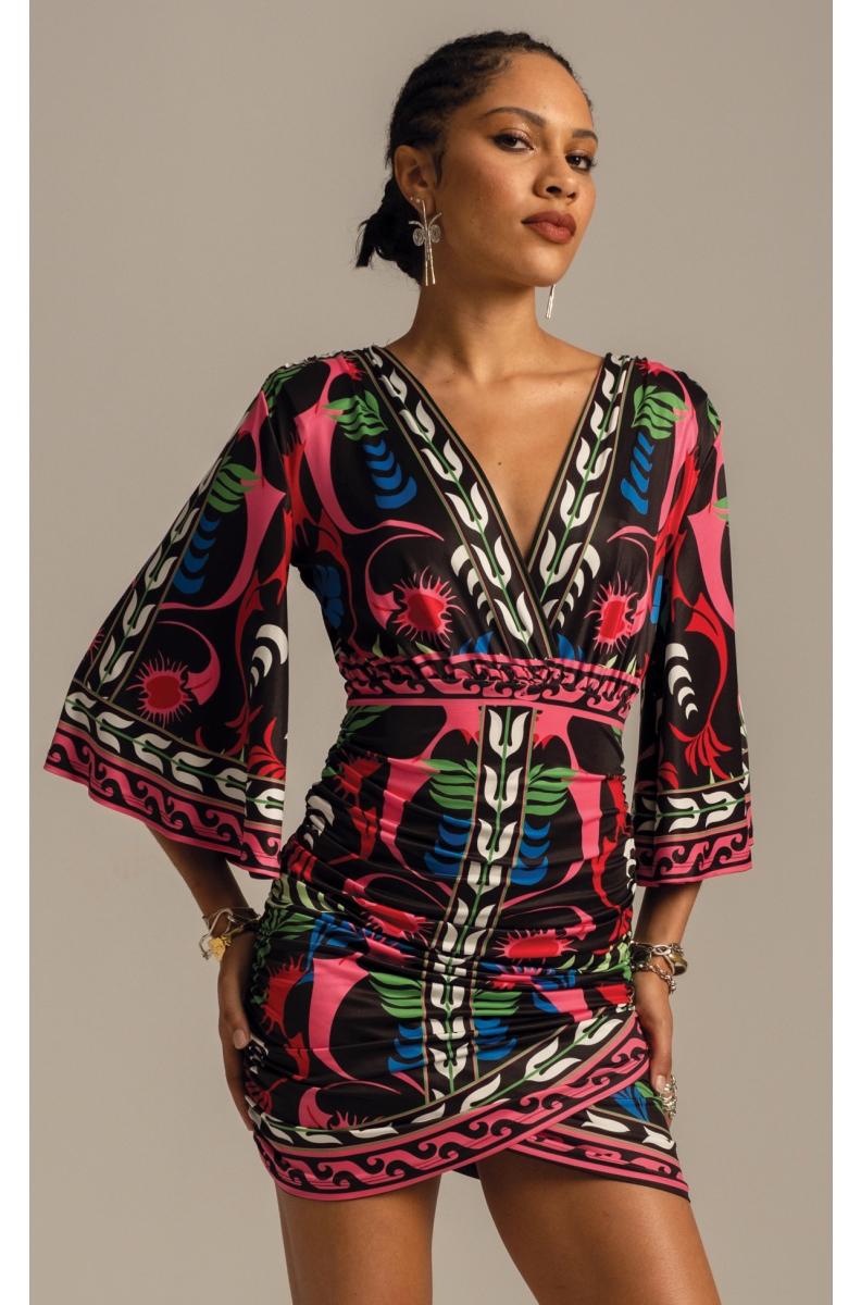 Our Narcissus Short Dress with 3/4 length bell sleeves and deep wrap effect neckline captures the essence of feminine energy. Smooth stretch jersey gathers at the elasticated empire waist, fitting over the hips into a gathered mini skirt. A colourful botanical placement print on black enhances this figure flattering silhouette.