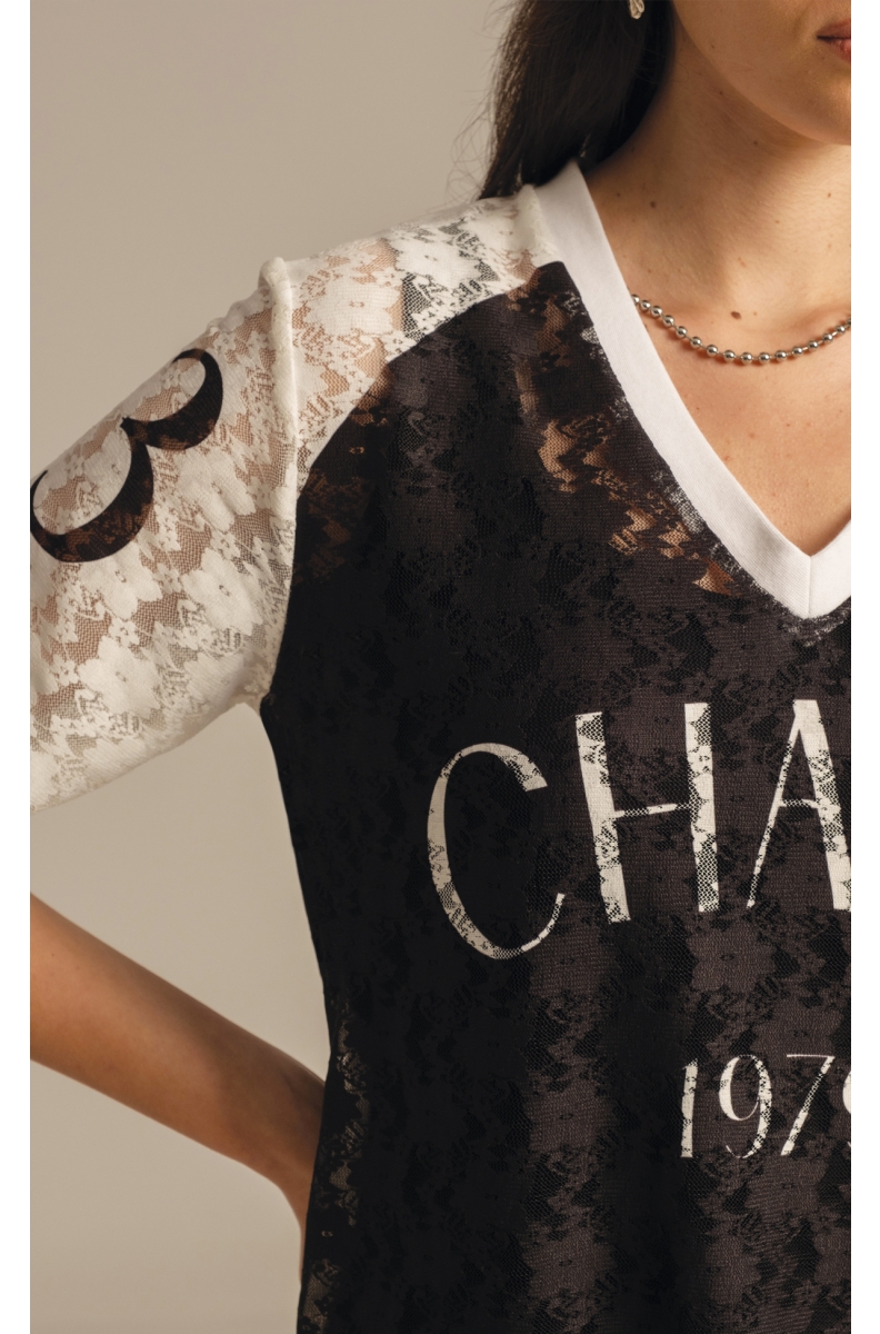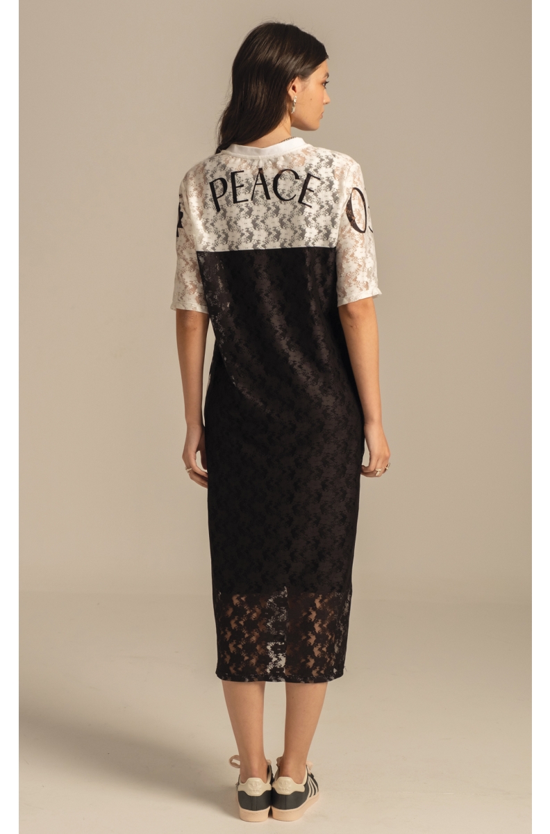 Our Cosmos Lace Long Dress captures P+C’s signature upscale casual style. This two-piece t-shirt dress of delicate, stretch lace over an opaque black jersey slip dress has a boxy fit and a V-neck rib detail. The black and white placement print features sporty elements like our Chaka symbol on ¾ sleeves, an athletic stripe down the sides, Chaos logo on the front and Peace logo on the back – and a special woven P+C label in red.