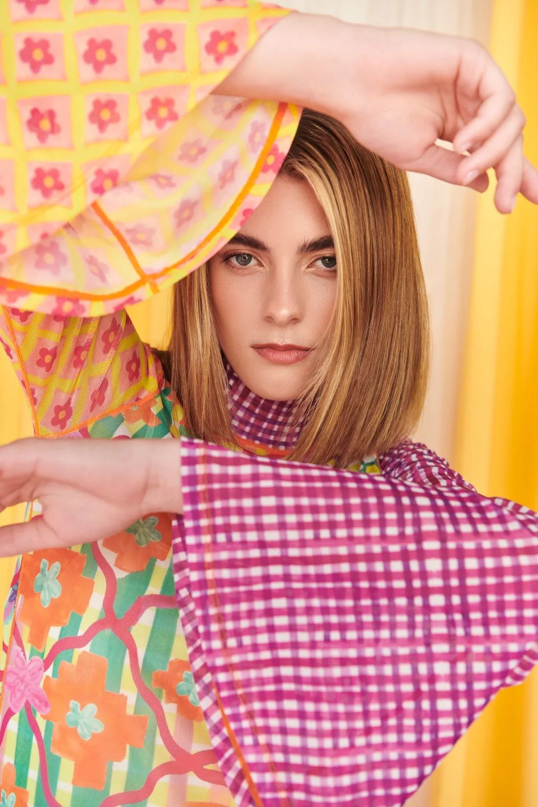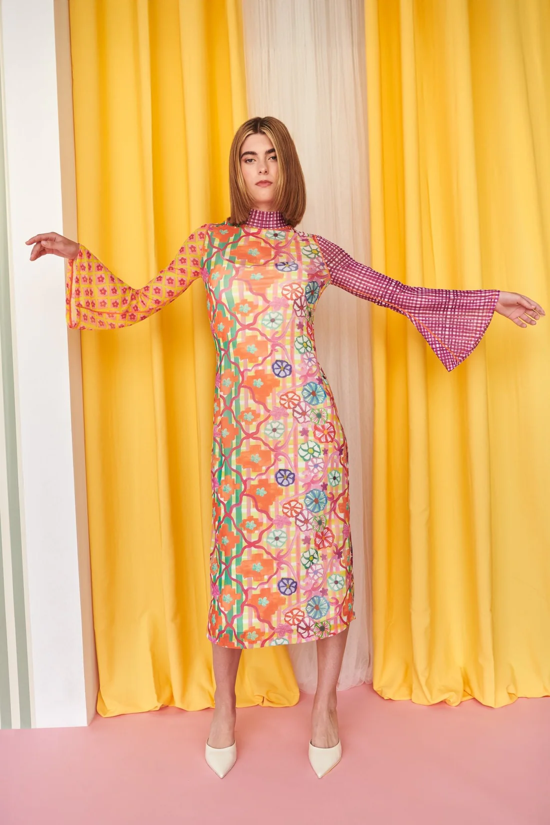 The Mystic Wanderer dress is above all, versatile. A vibrant midi dress that features a mix of colorful geometric patterns and contrasting sleeves for a striking visual effect. The bell sleeves add a retro touch, while the fitted silhouette exudes modern elegance. Perfect for those who want to make a statement!