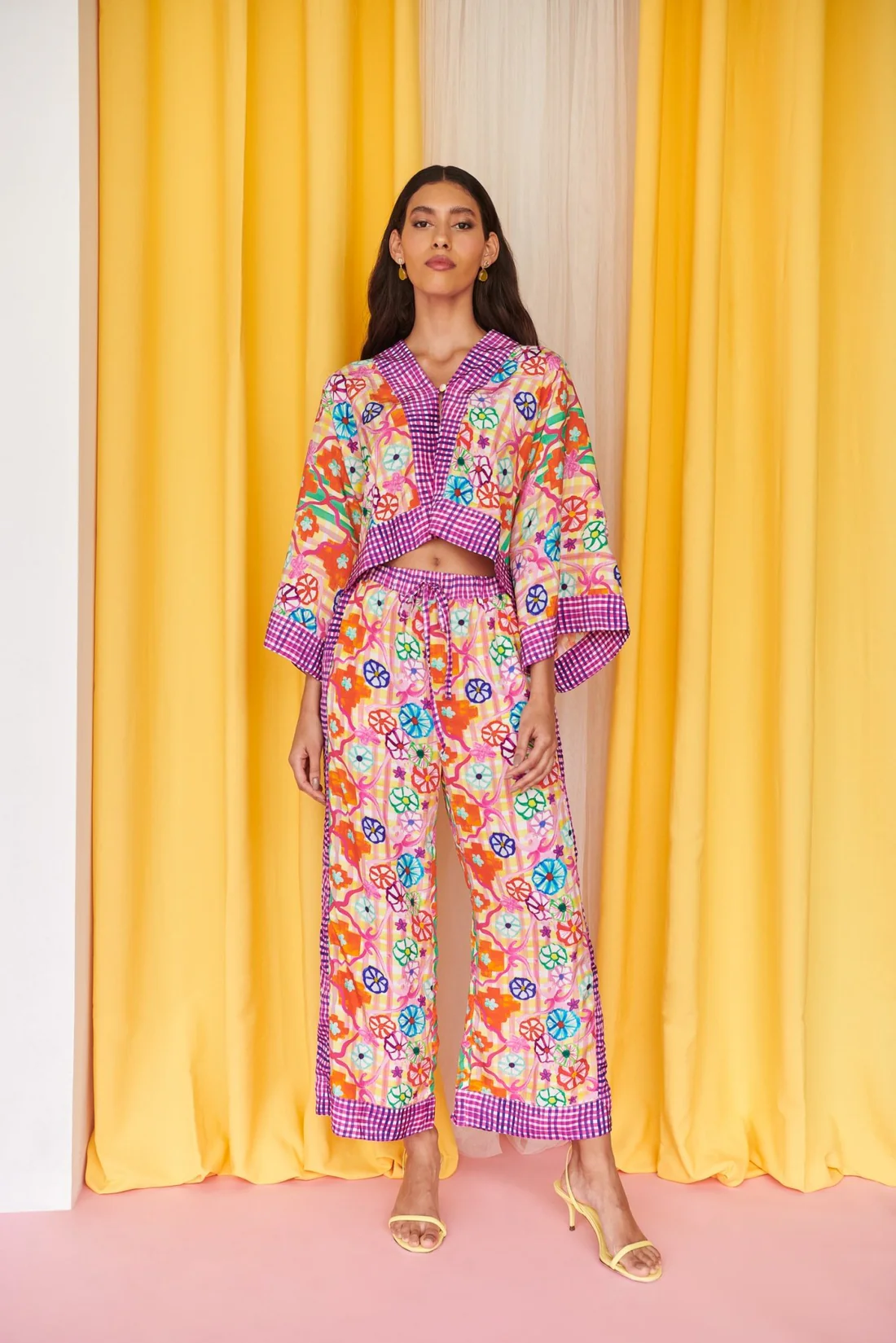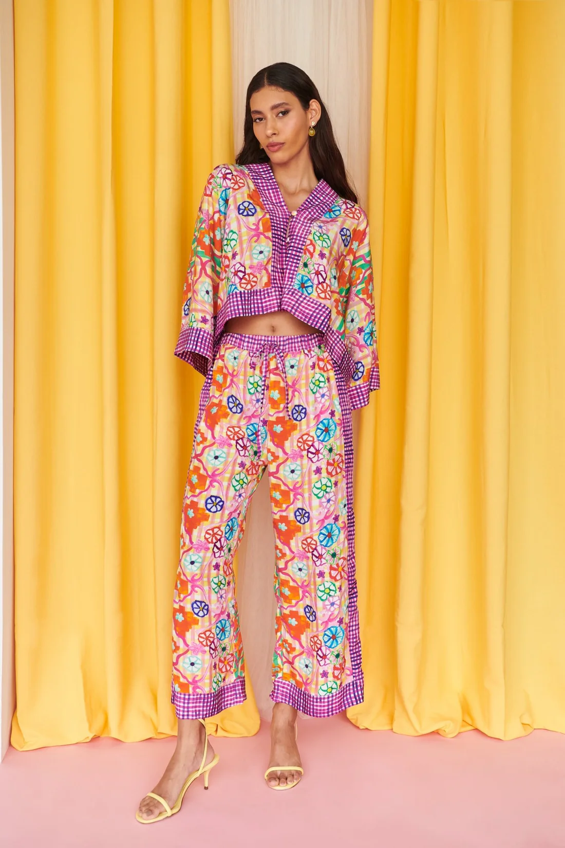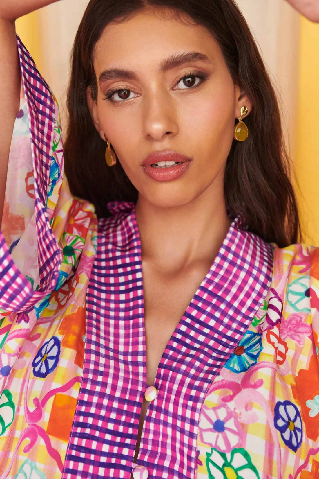 Make a bold statement with this dynamic, mixed-print blouse that merges floral motifs with gingham accents for a playful yet sophisticated look. The loose-fit design offers comfort, while the structured collar and button-up front add a touch of classic elegance. Wide cuffs adorned with contrasting gingham detail enhance the flowy sleeves, in a yellow and purple pattern. Perfect for pairing with matching or solid-color bottoms!